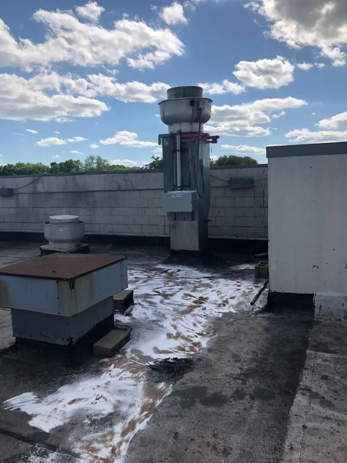 Finally to clean up the grease on the roof we applied Grease Away, to help emulsify and neutralize the liquid grease. After 72 hours the emulsified grease is washed away with a hose while still following EPA standards for runoff.