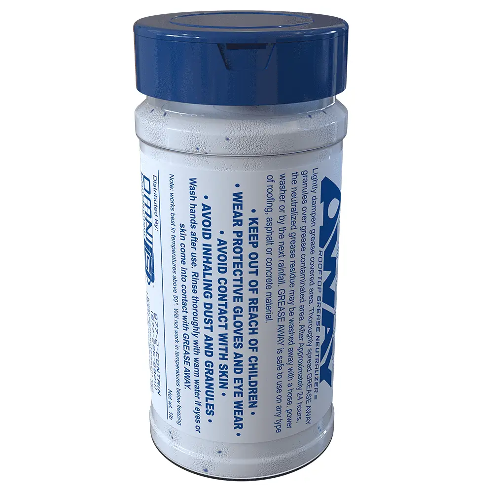 Grease Away™ is a biodegradable grease emulsifier engineered to neutralize, break down and dissolve the remnants of fat based greases and oils left on restaurant rooftops from ventilation discharge, and also grease spills in Grease Gutter™ rooftop grease protection system to contain grease discharge from your ventilator, simply sprinkle the fine white granular beads on the grease saturated surfaces and within a week the harmless by-product of grease can either be rinsed away by hose or the next rainfall. It’s that simple!