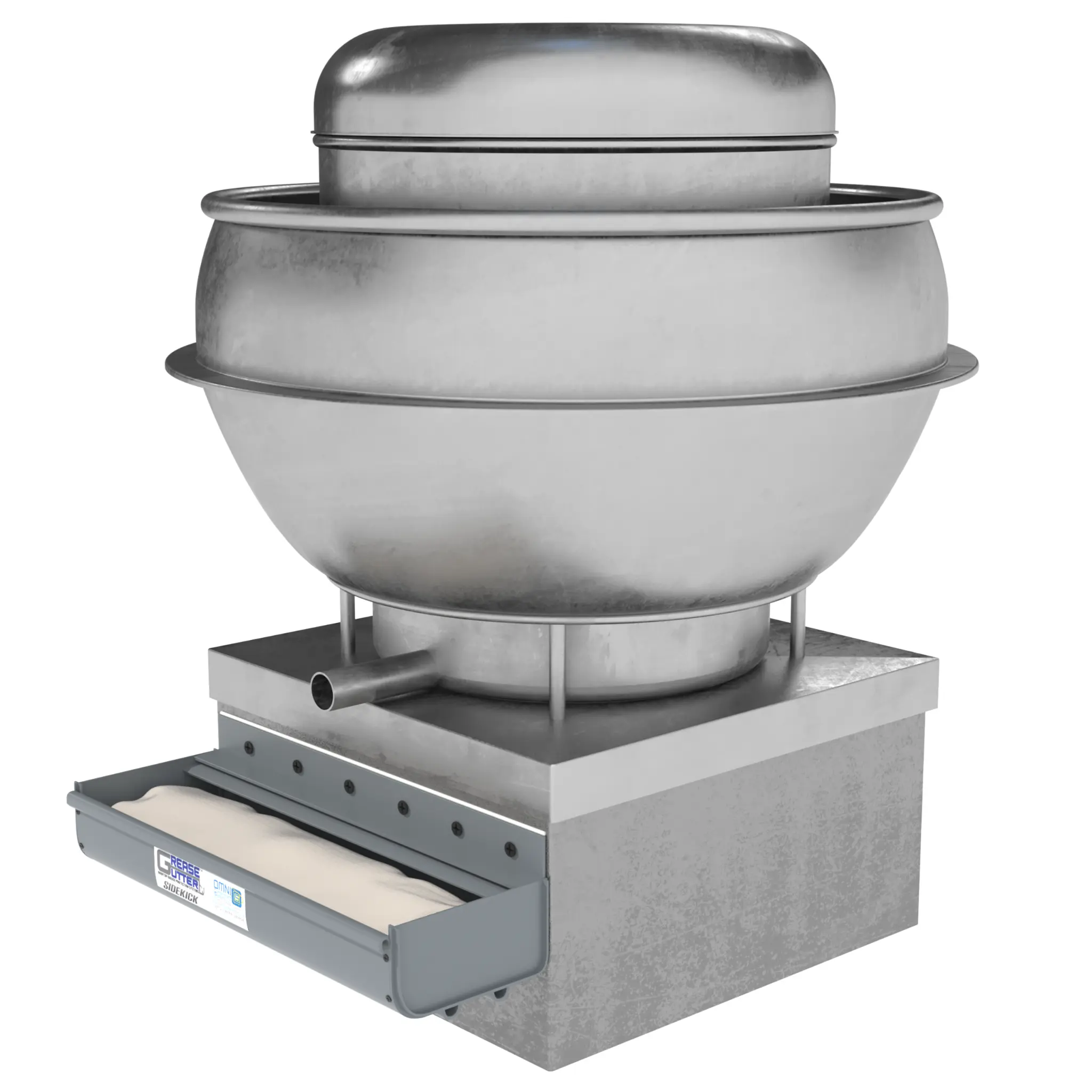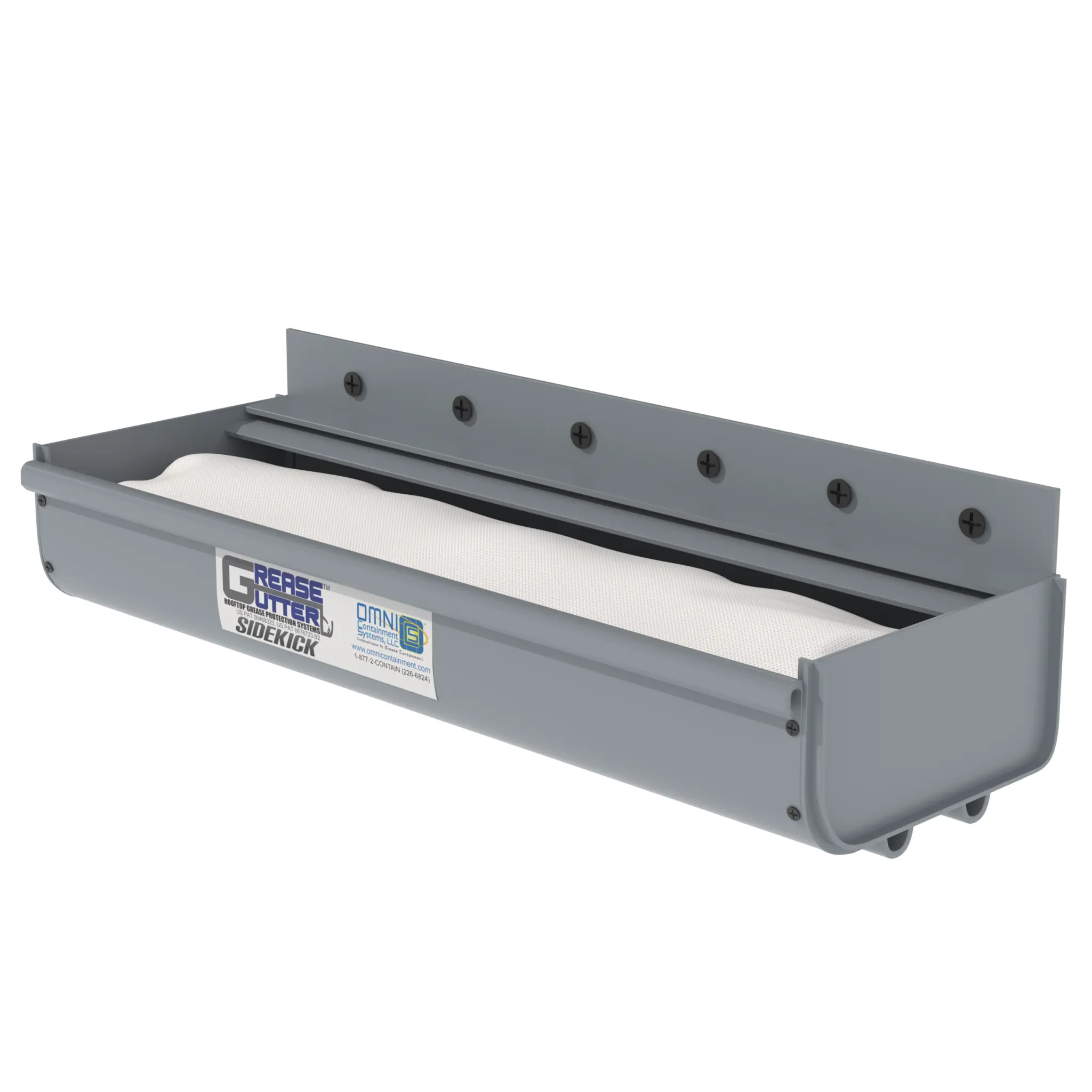 The patented Grease Gutter Sidekick grease containment system is used in conjunction with rooftop fan systems to collect grease as it accumulates on and around the the fan system. The system uses a patented hydrophobic filter the absorbs grease but sheds water.